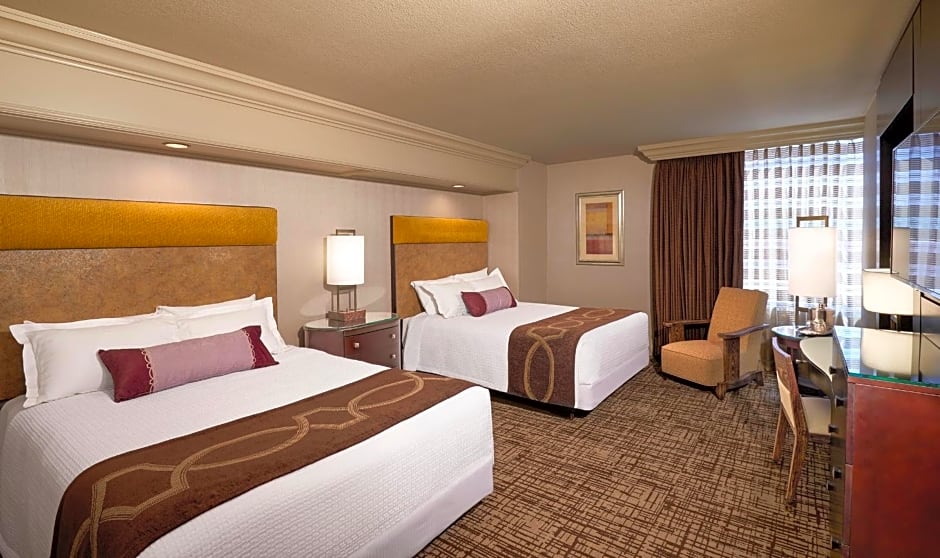 A view of the Las Vegas strip with floor to ceiling windows is offered in this room. A seating area with a flat-screen cable TV, and safety deposit box are also available.